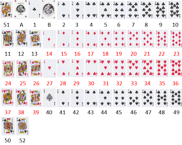 Utilizo una baraja de póquer con dos comodines ('jokers') y numero sus cartas secuencialmente del 1 al 52 (del As al Rey y con el siguiente orden de sus palos: tréboles, diamantes, corazones y picas), y a los dos comodines, que deben ser distintos, los rotulo como 'A' y 'B':